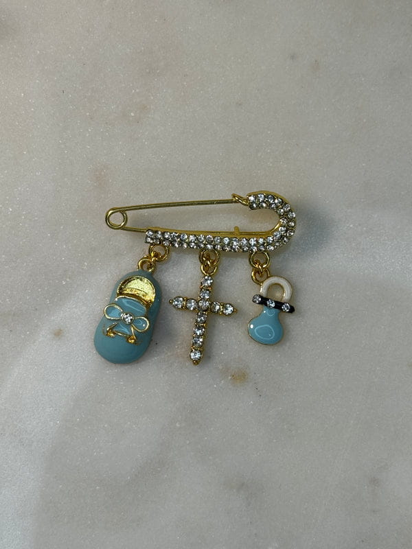 This stunning three-loop diamond pin features a sparkling diamond cross, a baby pacifier, and a baby shoe, representing the joy and wonder of new beginnings.